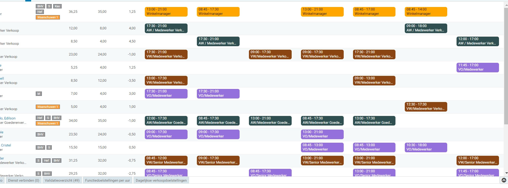Daarnaast kunnen we in het rooster de beschikbaarheid van het personeel zien en waarom iemand vrij heeft gevraagd. Bij het maken van het rooster moest ik op een aantal zaken letten, zoals vaste avonden, vakantieaanvragen, eventuele langdurige ziekte, enzovoort. Als er een overlap in beschikbaarheid is, geeft het systeem dit ook aan. Bovendien moet ik rekening houden met de verschillende functies van het personeel op de winkelvloer, zoals BHV'ers, heftruckchauffeurs, kassamedewerkers, zagers en mengers. Ook zijn er vaste werktijden, met begin- en eindtijden om 9:00, 13:00, 17:30 en 21:00 uur.