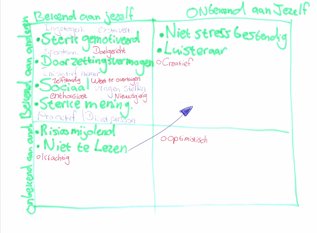 Jessie heeft uiteindelijk mijn Johari venster bekeken en beoordeeld. Hij vond dat alle eigenschappen in het goede vak waren ingedeeld. Alleen 'niet te lezen' bleek uiteindelijk in het verkeerde vak ingedeeld te zijn. Dit omdat ik wel voorspelbaar ben. Daarom heeft hij met een pijl de eigenschap verplaatst naar blinde vlek geplaatst. Verder waren geen aanvullingen nodig.