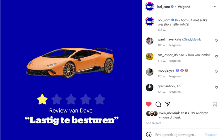Ik vind deze foto van bol.com grappig en verrassend. De combinatie van een bekend persoon, een dure auto en een humoristische verwijzing naar het product van bol.com maakt het een opvallende en succesvolle marketingcampagne. Ik kan de humor inzien van de tekst 'lastig te besturen' bij een mini-Lamborghini, gezien de context van de foto van Roelvink die een echte Lamborghini heeft gecrasht. Het maakt het merk bol.com menselijk en verfrissend en ik vind het leuk om te zien dat ze niet bang zijn om risico's te nemen in hun marketingstrategie.