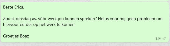 Hierop kreeg de collega op dezelfde dag nog een bericht dat het akkoord is om in gesprek te gaan. Hiervoor hebben ze de dag uitgekozen zoals het in het bericht staat.