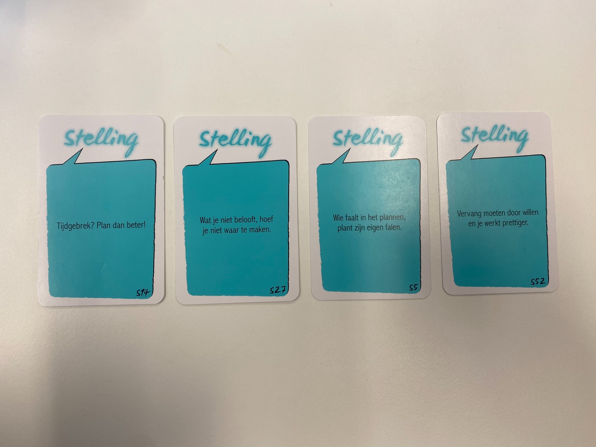 Deze stelling vind ik goed bij mijzelf passen omdat ik vaak tijdgebrek heb. Bijvoorbeeld het plannen van mijn studie of tijdens mijn werkzaamheden op het werk, Als ik leiding geef aan mijn collega's, komen we soms in tijdsnood. Daarom wil ik beter leren plannen. Zowel mijn eigen plannen dan voor een ander. Een concreet voorbeeld is dat ik op een zondag een collega een schap liet ombouwen, maar door tijdsnood niet kon afmaken omdat we de folder van volgende week moesten uitbrengen.