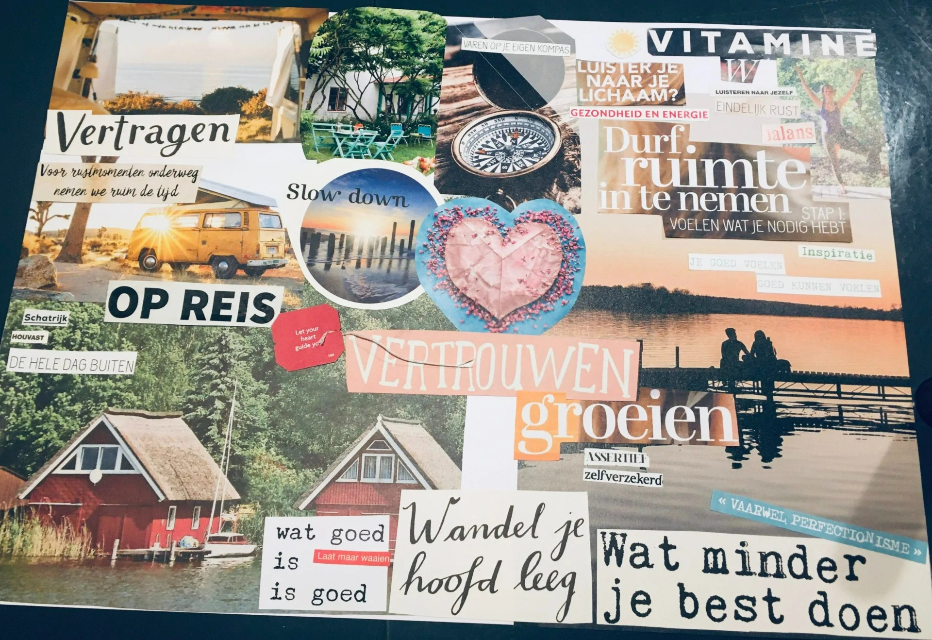Een Vision Board is collage van foto's, plaatjes, en citaten van jouw dromen, wensen, en doelen dat moet zorgen voor inspiratie en motivatie. Het is een tastbare, visuele weergave van jouw visie voor jouw toekomst. Het geeft in beeld weer waar je naartoe wilt: wat je wilt bereiken.